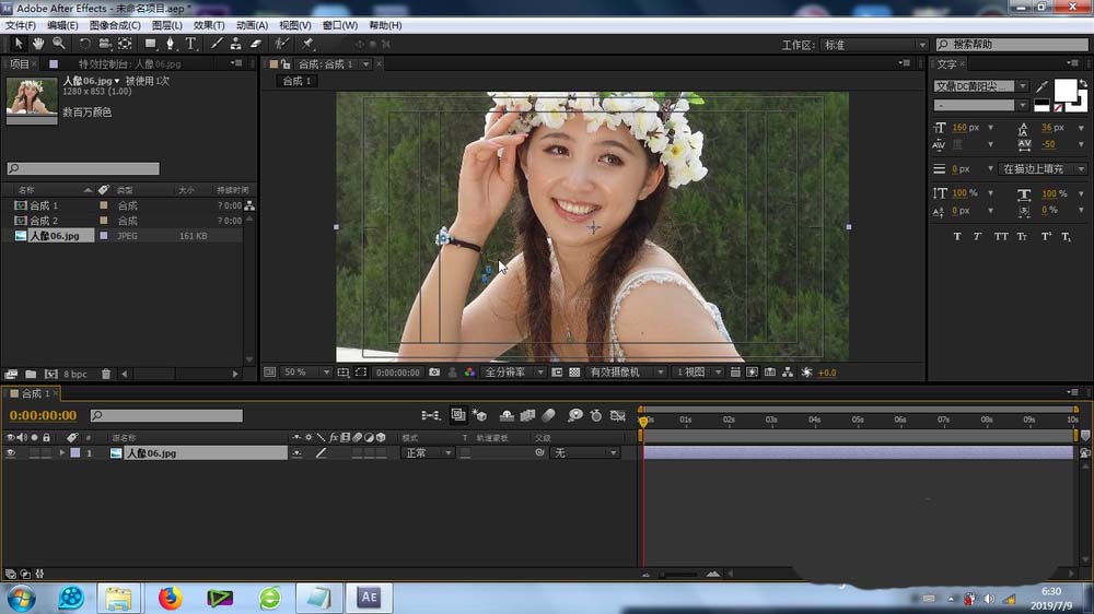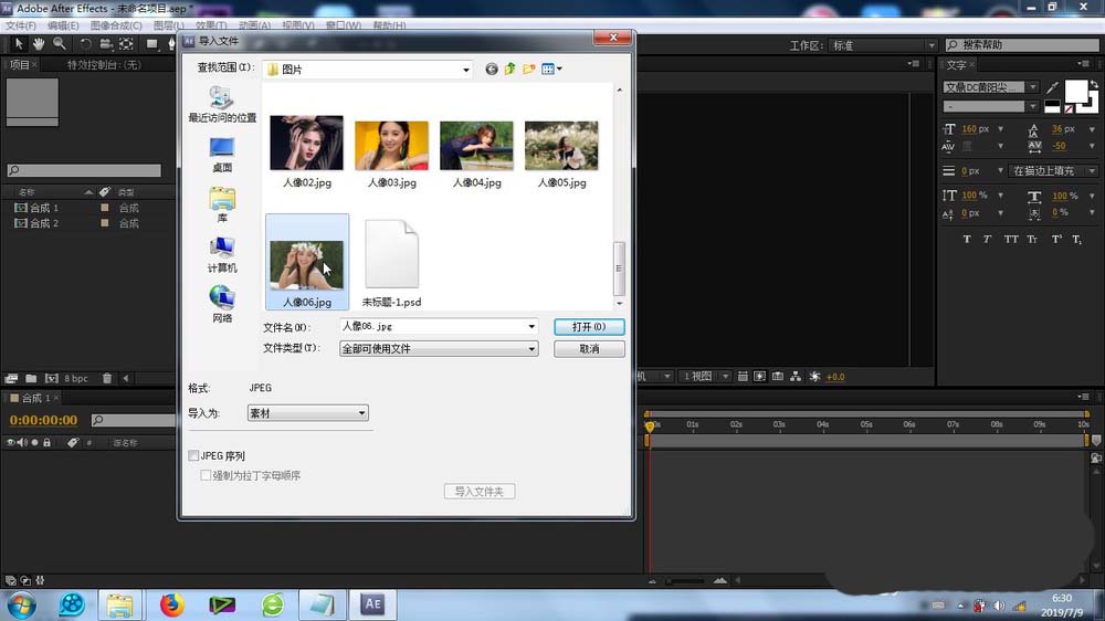 1、首先就是素材的导入,这个导入的方法很简单,不再赘述,将素材库的素材拉至合成里面的时间线上