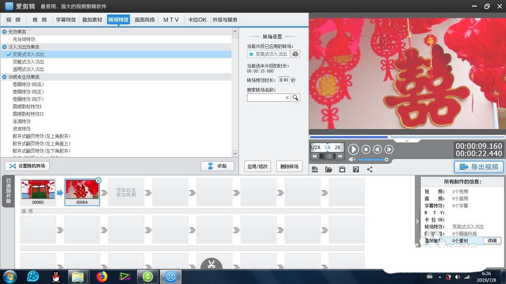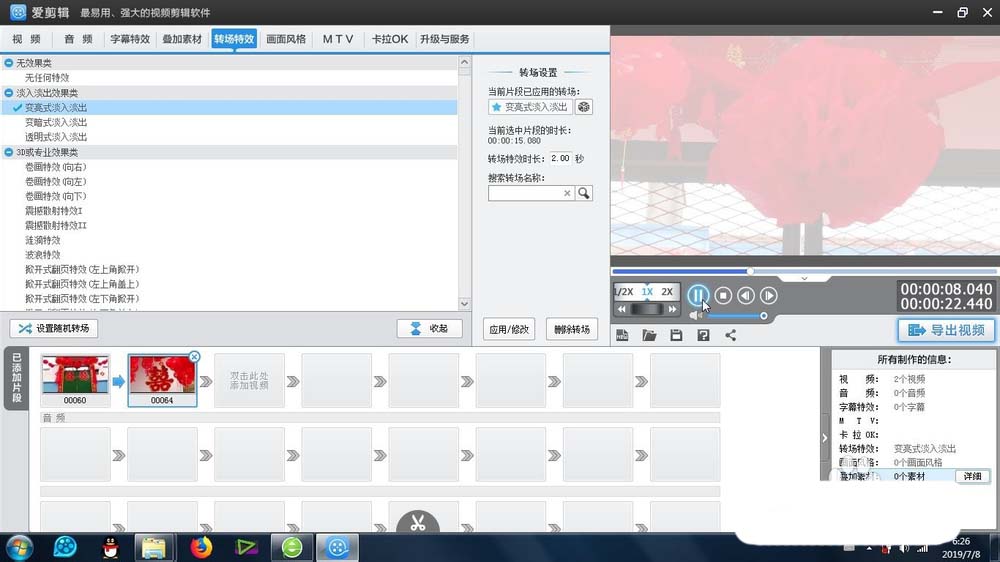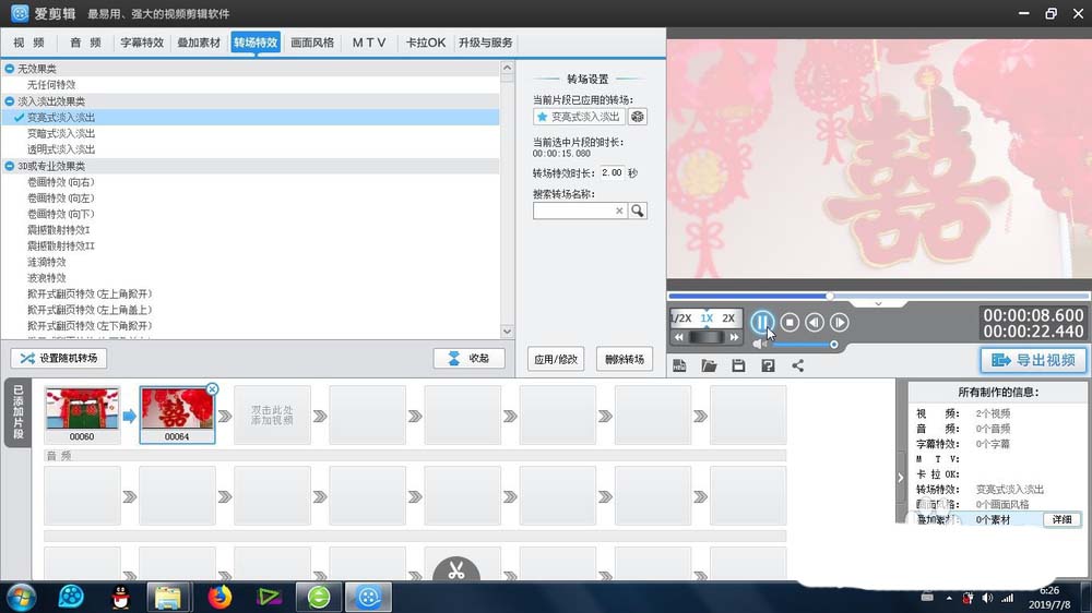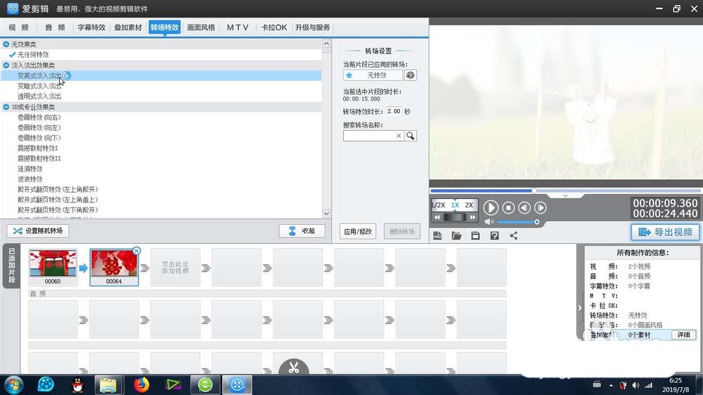 1、首先这个变亮式淡入淡出效果 -是在爱剪辑里面的转场特效-淡入淡出效果类-里面可以找到在时间线上进行两端视频的选择添加