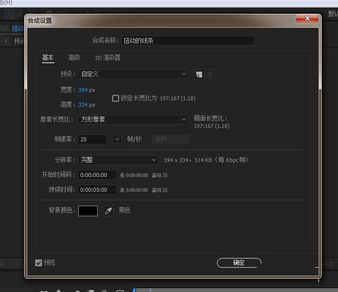 1、打开AE软件,新建合成,命名扭动的线条,调整相应的参数。