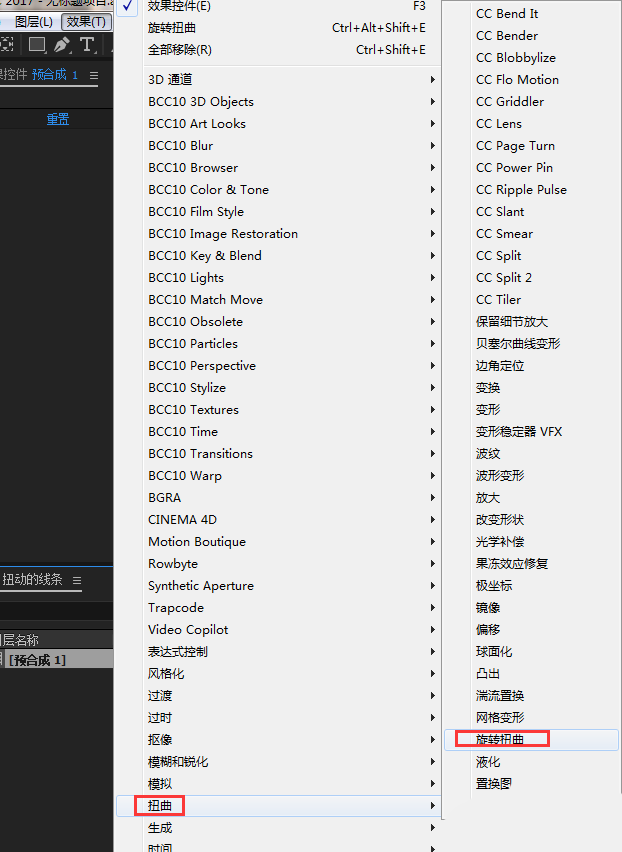 5、选中预合成,添加旋转扭曲效果;效果-扭曲-旋转扭曲;