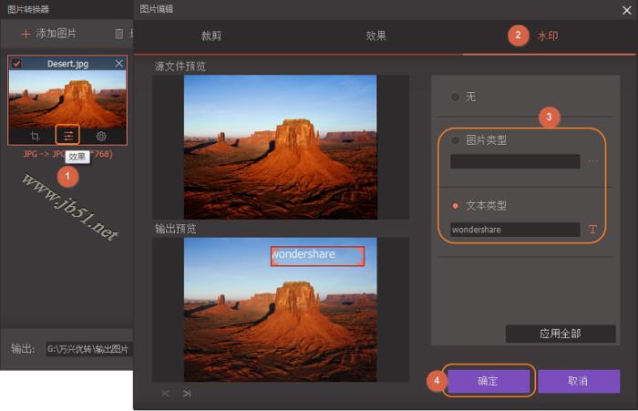 添加水印:单击图像上的效果按钮以打开编辑窗口。单击水印选项,您将可以添加图片水印或文本水印。