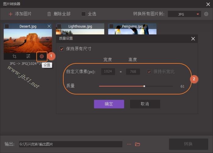 调整图片大小:单击图片上的设置按钮,质量设置窗口将会弹出。您可以选择保留原有尺寸, 或对图片宽度或高度进行自定义改动。移动质量条以更改图片质量。然后单击确定按钮以保存更改。