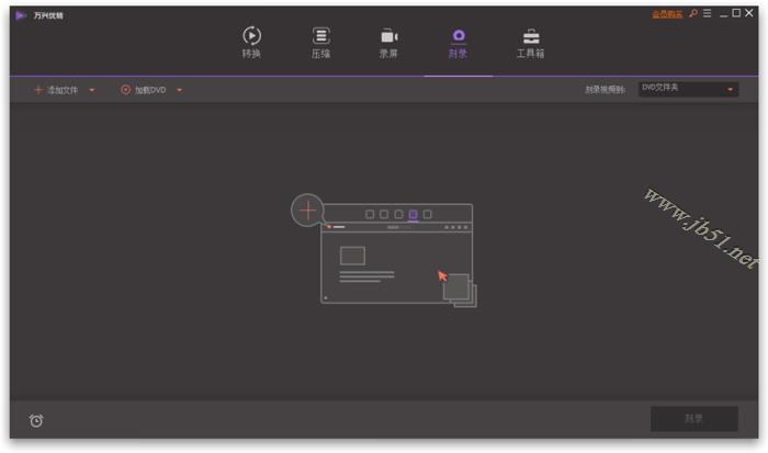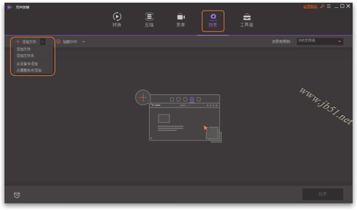 开启万兴优转后在主界面上方切换至刻录标签页,您将会看到以下的界面。在这里您有三种方法导入视频。