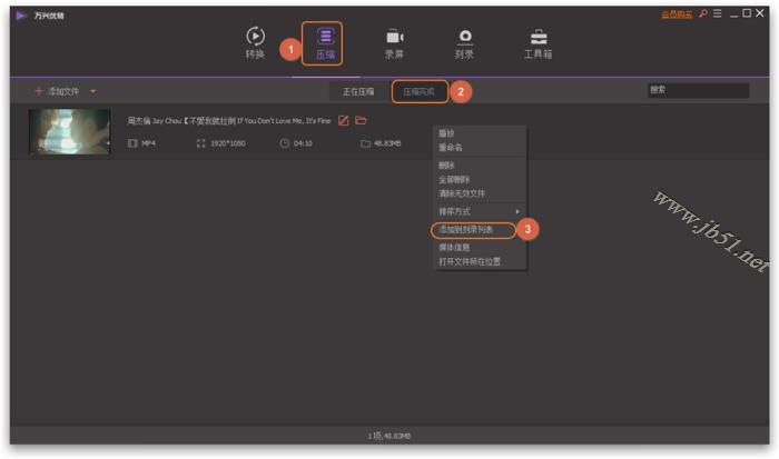 切换标签页压缩 > 压缩完成寻找您要刻录的视频,右键点击并选择添加到刻录列表。