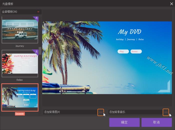 随后将会弹出一个DVD模板窗口,可以自己添加喜欢的背景或音乐。
