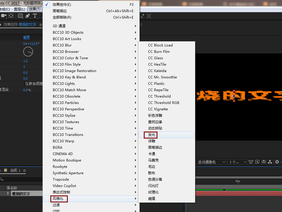 1、打开AE软件,命名燃烧中的文字效果,调整相应的参数。