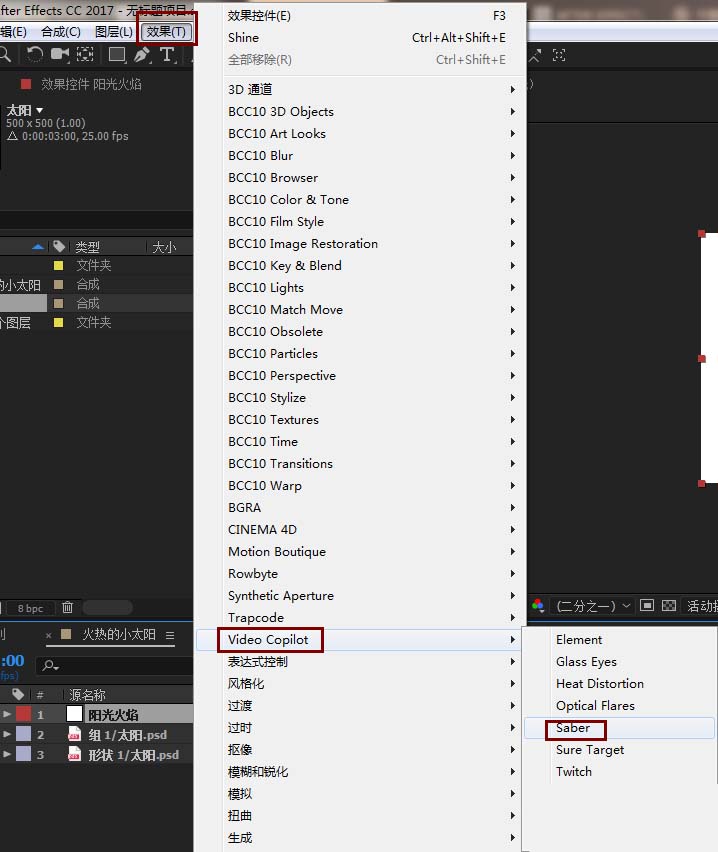 3、ctrl+y新建一个固态层,作为Saber插件的载体;选中固态层,添加Saber效果;效果-Video Copilot-Saber;