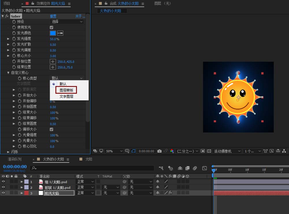 5、绘制完轮廓之后再Saber插件上自定义核心选项中把选择图层蒙版;选择之后就会只能的沿着我们刚刚绘制的轮廓来产生光线;