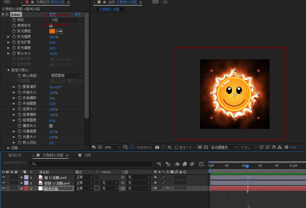 6、选择预设火焰调整核心大小线条等参数;按下空格键就可以看到燃烧着火焰的小太阳。