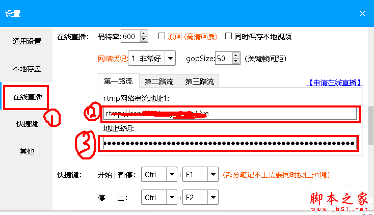 2、进入设置界面,点击【在线直播】,在【第一路流】中的【rtmp网络串流地址1】输入有效的rtmp网络串流地址,输入地址密钥