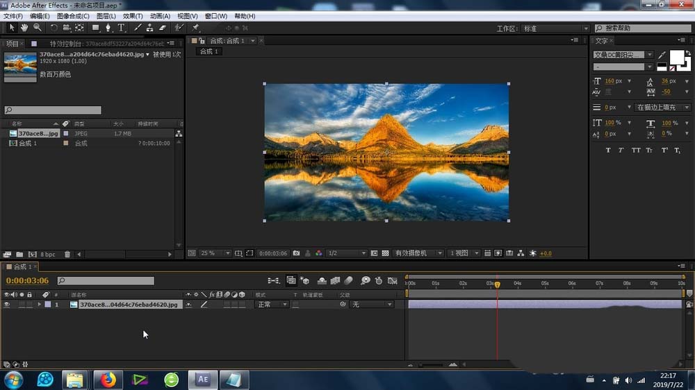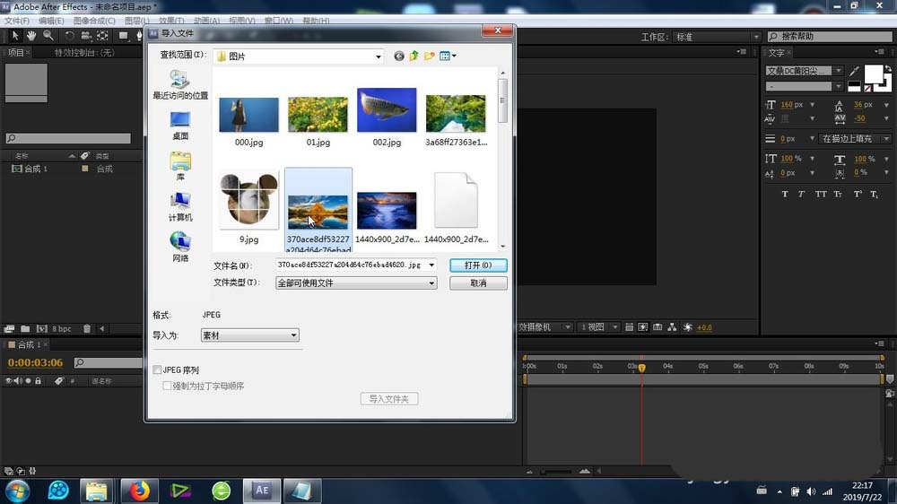 1、最首要的步骤就是图片素材的素材库导入,导进去之后再导入合成里面的时间线上