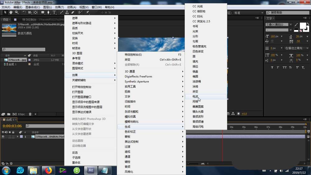 3、接下来的重点来了,选中素材,依次选择:效果-生成-电波