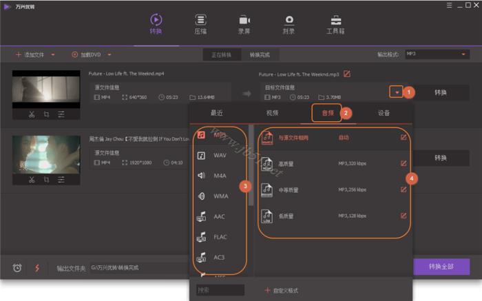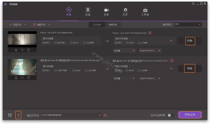 现在点击转换或全部转换按钮即可开始将视频转换成MP3音频文件。