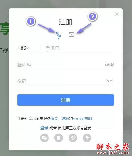 4、在「注册」页面,有两种注册方式,一种是手机注册,一种是邮箱注册。
