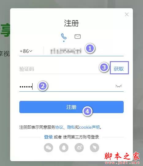 5、以手机号注册为例,在第一栏和第三栏填写手机号以及密码,然后点击「获取」按钮,输入手机短信收到的验证码,然后点击「注册」即可。