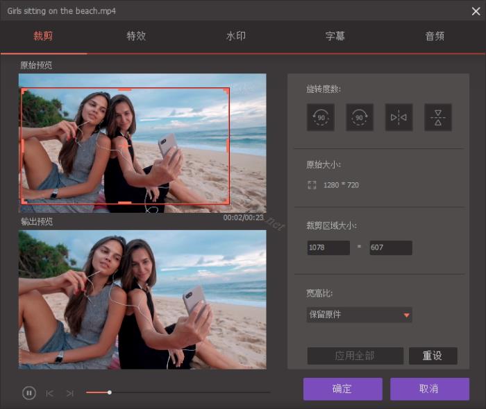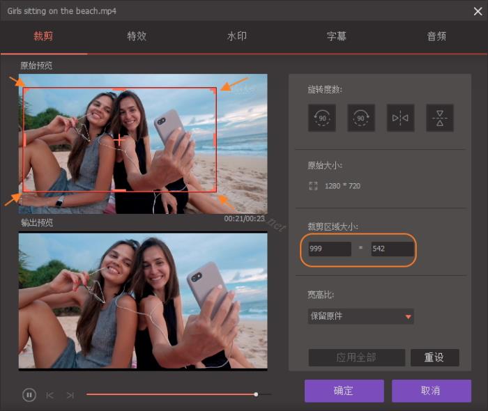拖拉视频的角落框或者输入具体的宽度和高度即可设置裁剪面积大小。您可以马上预览效果。