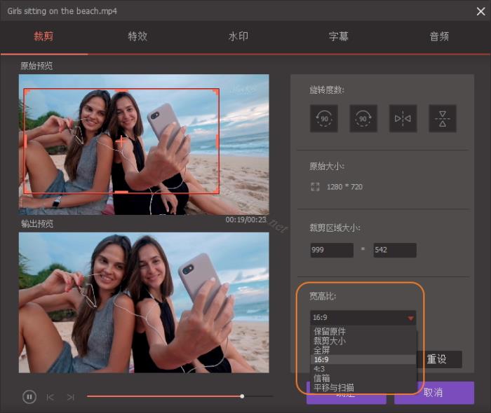 点击宽高比的下拉式图标。您可以选择保留原件、裁剪大小、全屏、16:9等等。