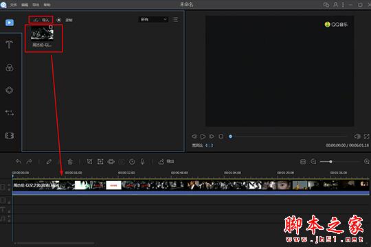 2、进入到软件的主界面,既然是要剪辑视频,当然是要先导入视频文件才行,成功导入后,将视频文件图拖动到下方的时间轴中,时间轴将会出现视频中每个时间片段的缩略图,如下图所示: