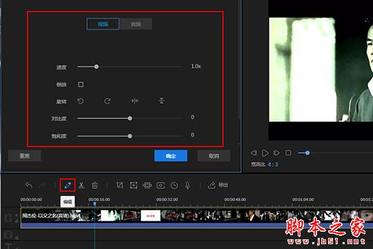 3、如果你想要对整个视频直接进行速度、倒放、旋转、对比度和饱和度的调整,则只需要双击时间轴中的视频,或点击红框标注内的“编辑”选项进行视频、音频的编辑,如下图所示: