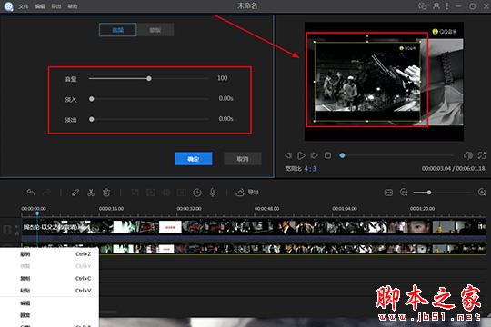 3,点击播放按钮进行播放,可以看到窗口中出现了两个不同大小的画面,其中较小的画面就是画中画了,软件默认将画中画的放置在中间的位置,如果你想要对其进行调整,则可以双击下方时间线中的画中画的视频文件,也可以右键选择并点击其中的“编辑”选项,在播放窗口选择黄色边框调整位置,接着在左边的音频栏中调整画中画的音量、淡入与淡出等数值,如下图所示: