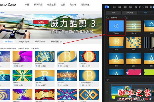 3、如果你认为威力酷剪中的转场模板没有你需求的那种效果,也可以点击红框标注内的“下载模板”选项,弹出威力酷剪的官网后在其中寻找合适的素材,每一个转场素材的热门程度全都一览无余,大家只需要从中下载并导入威力酷剪即可,如下图所示: