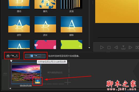 4、每个被添加转场动画的媒体文件,在下方都将出现之前所添加的转场标识,大家还可以根据自己的需要选中转场动画进行删除与持续时间的设置,当然如果你认为一个一个添加转场太过麻烦,也可以选中点击红框标注内的“对所有视频应用随机转场效果”、“对所有视频应用淡化转场效果”选项进行一键添加,如下图所示:
