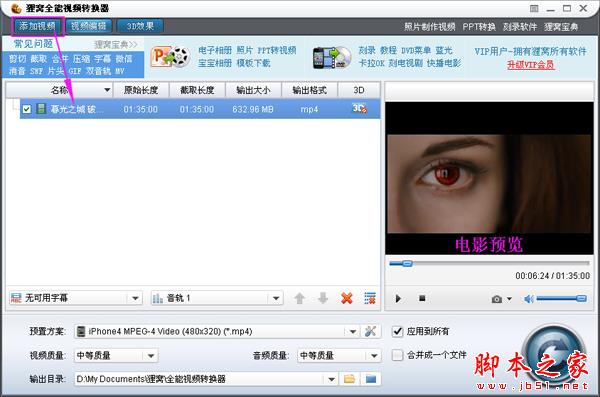 我们首先打开狸窝全能视频转换器,然后进入界面菜单后,请点击“添加视频”功能按钮,选择并打开需要编辑处理的电影。