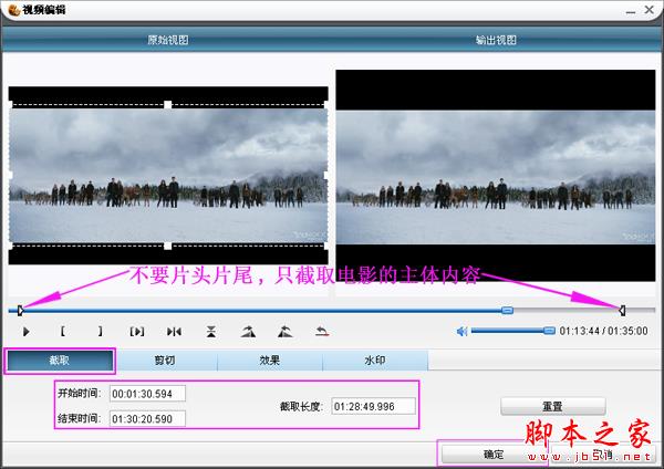 接着大家请点击界面左上方的“视频编辑”功能选项,请拖动播放状态条以确认片头及片尾占用的时间段,再依次点击“截取——确定”功能按钮。