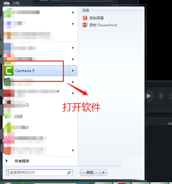 1、点开window图标,选择所有程序,然后在电脑所有程序中找到Camtasia 9并单击启动打开。