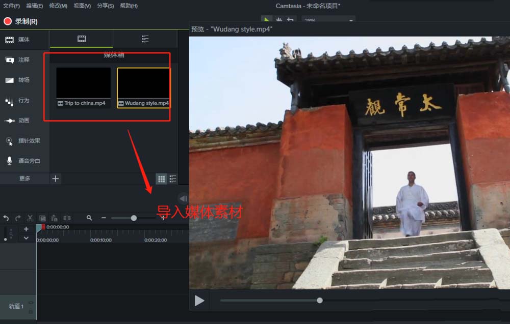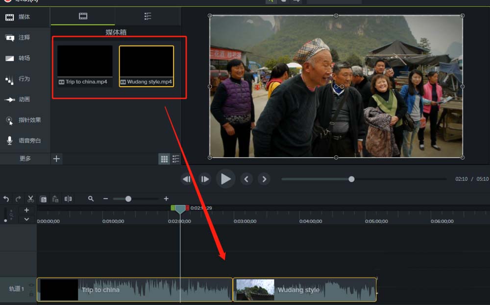 2、选择两个不同的视频素材媒体导入到Camtasia 9项目中,可以通过双击鼠标放大预览视频媒体素材。