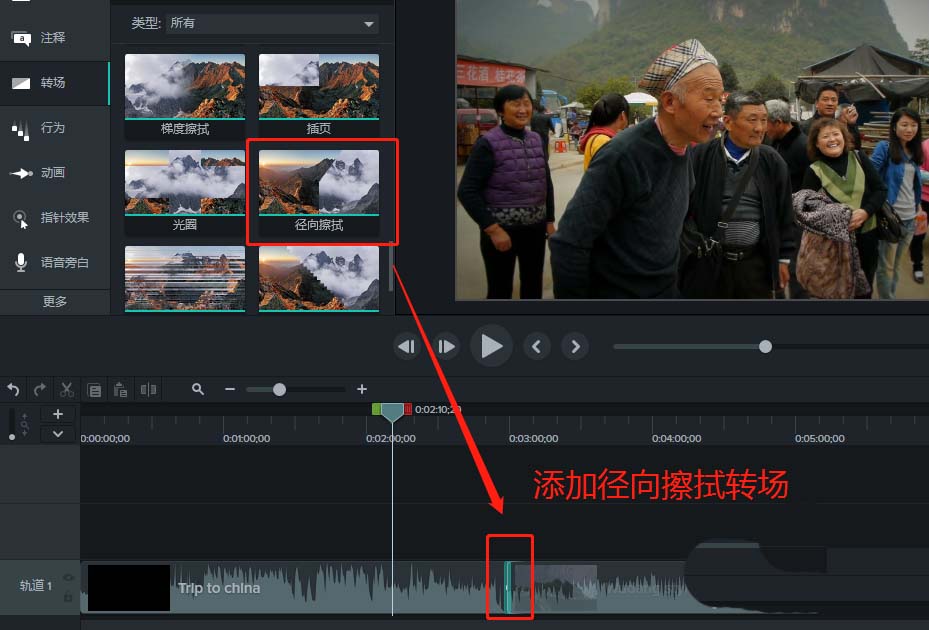 4、切换并打开显示转场面板,在Camtasia 9转场面板中找到“径向擦拭”转场,将径向擦拭转场给两个视频素材添加。