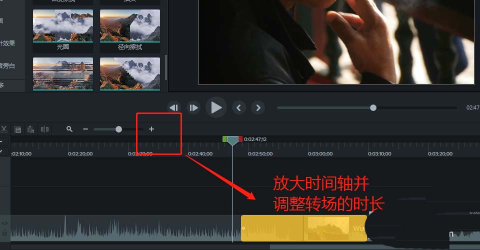 5、放到时间轴,将过渡的部分处于时间轴的能看见的中间位置,并调整径向擦拭转场的时长。
