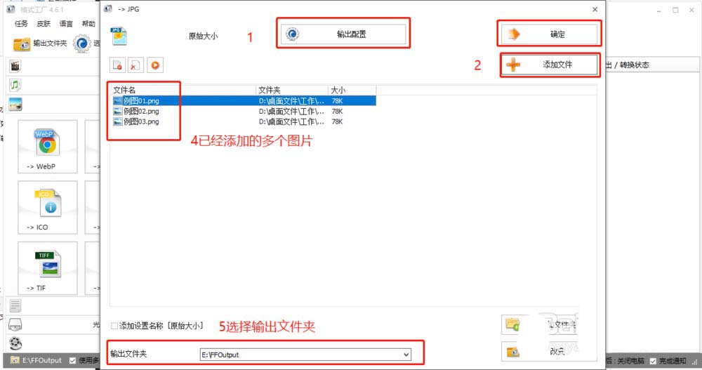 1、打开软件格式工厂,设置好输出配制,点击添加文件,打开后可以在文件列表中看到选中的文件,确定输出文件夹,点击确定,进入执行页面。