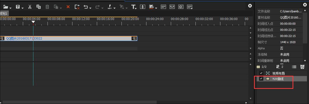 选择YUV曲线,将其拖拽放置到时间轴上的素材中,在右边信息窗口即可显示YUV曲线,如图,