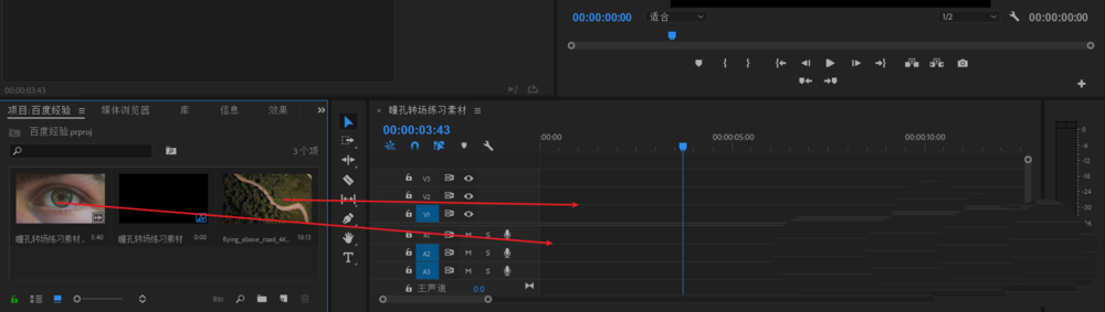 1、首先,老规矩,把准备好的两个视频素材拉到右边