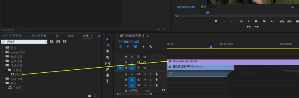 3、效果栏找到闪光灯,往右拖到第上面的视频