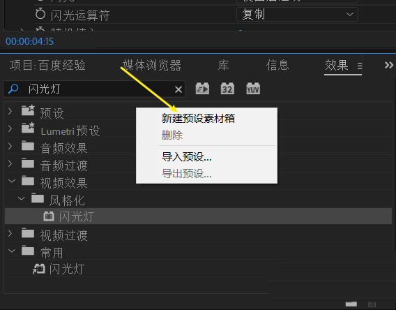 4、这里交大家个方法整理特效,不应每次都打字搜,右键选择新建预设即可,然后把常用的特效拉进去