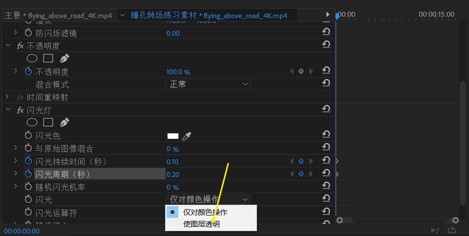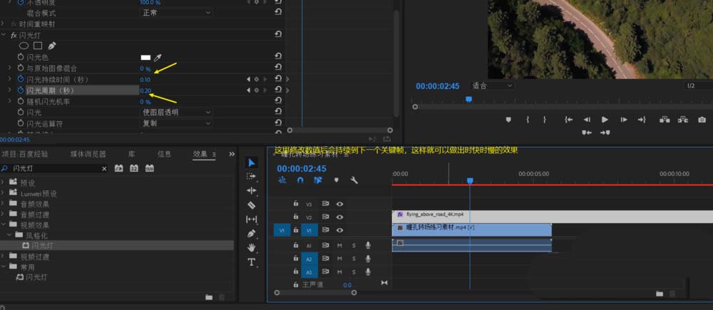 5、回到正题,左上角特效控件,往下拉看到闪光灯为止,把闪光持续时间和周期分别改为0.1和0.2,周期一定要比持续时间长