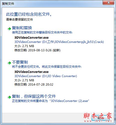 7.将安装包中Crack文件夹里的"3DVideoConverter.exe"复制到软件安装目录,选择复制和替换,软件安装目录为"D:\3D Video Converter"