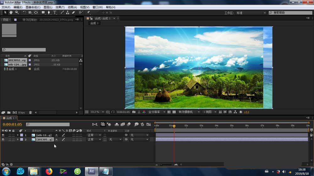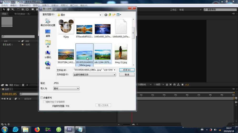 1、最首要的步骤就是图片素材的素材库导入,导进去之后再导入合成里面的时间线上