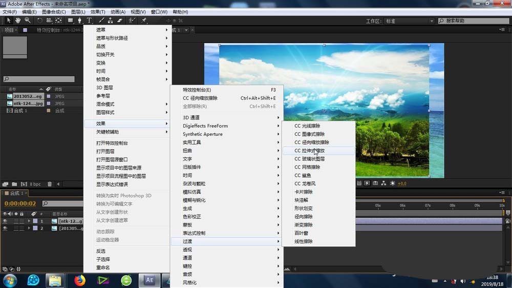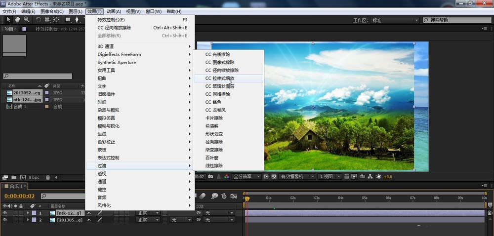 3、接下来的重点来了,选中素材,依次选择:效果-过渡-拉伸式缩放效果