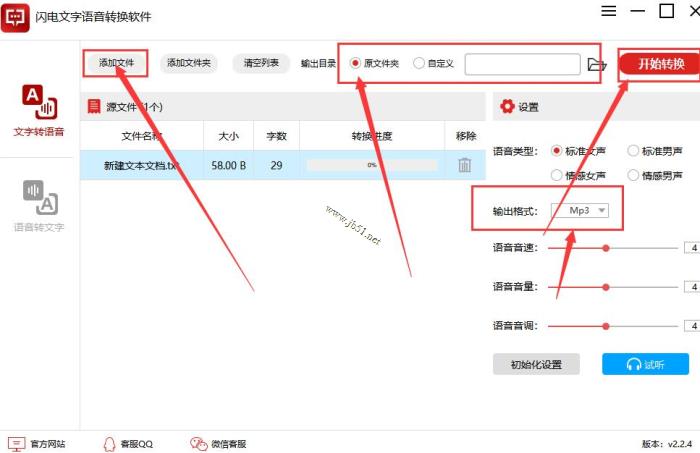 4、选择语音类型,输出格式,以及根据需求调整音速、音量,音调等