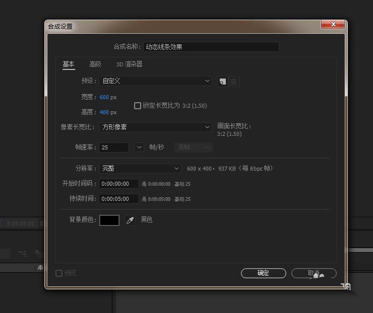 1、打开AE软件,命名动态线条效果,调整相应的参数。
