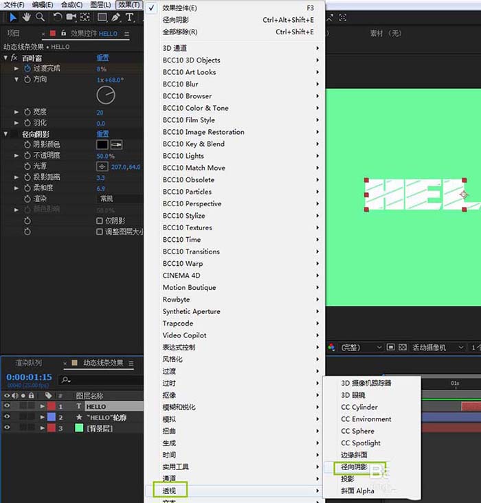 1、选中文本图层,添加径向阴影效果;效果-透视-径向阴影;