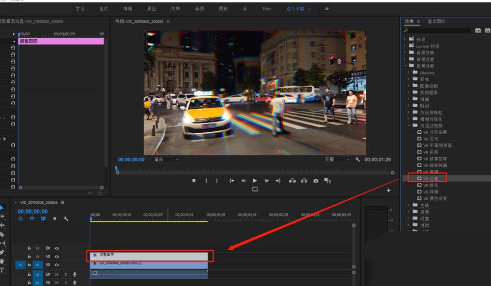 3、在PR视频效果中找到VR色差这个效果,将VR色差的效果拖到调整图层上。