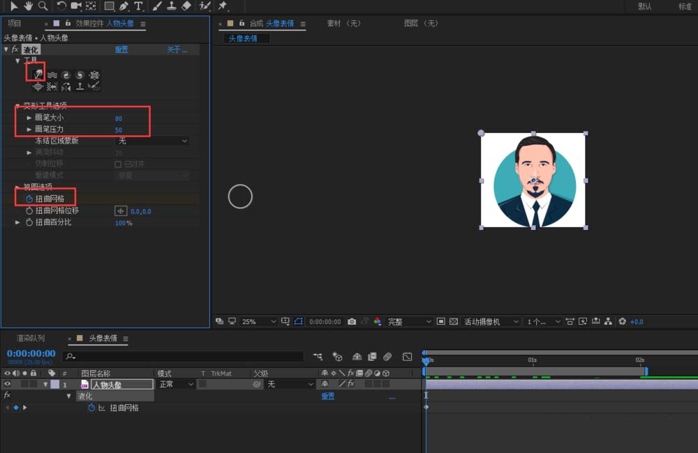 5、适当的调整涂抹工具的笔刷大小和压力,给扭曲网格k关键帧来记录我们涂抹的形状;来实现人物表情的动画;
