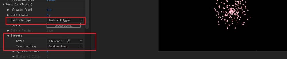 3、然后点击我们的固态层,更改我们的粒子参数,先把特效中设好的白色颗粒换成花瓣。操作是在效果控件把粒子类型改为多边形纹理,材质图层设置为我们的花瓣图层,