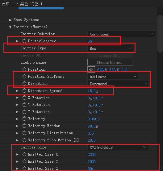 5、在发射器位置上,更改下列参数粒子每秒56个,发射类型是盒子,方向就是方向,方向扩展是15,速度3100,发射器xyz分别为,2300,1000,804。