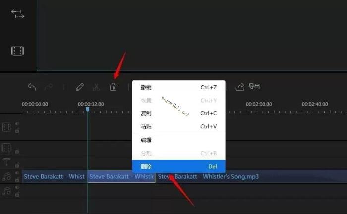 4、分割后的音乐如果是我们不需要的,可以在选中后点击工具栏的“删除”按键来删除,或者也可以在选中音频后,直接点击键盘上的“Delete”键来完成此操作。