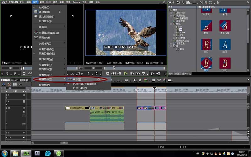 2、点击“状态”,编辑画面的时间吗就会去掉了,在重复上面的动作,时间码又会在编辑和预览窗口出现了。